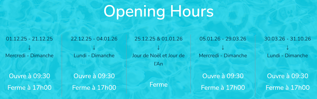 Le parc fonctionne toute l’année grâce aux vétérinaires et autres membres du personnel qui doivent s’occuper des dauphins, des lions de mer, des perroquets et des reptiles. Les périodes/heures d’ouverture pour 2026 sont les suivantes :